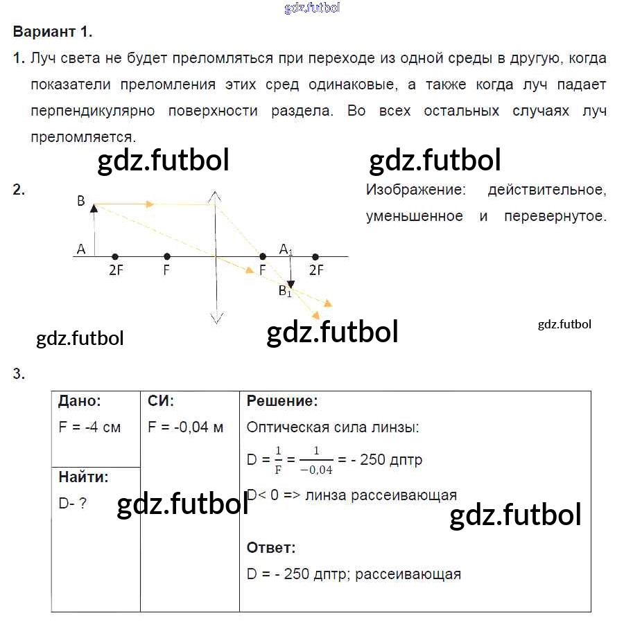 Готовые домашние задания по Физике за 8 класс Марон Дидактические материалы Вертикаль 2016 ФГОС - СР №13. Преломление света. Линзы. Варианты 1