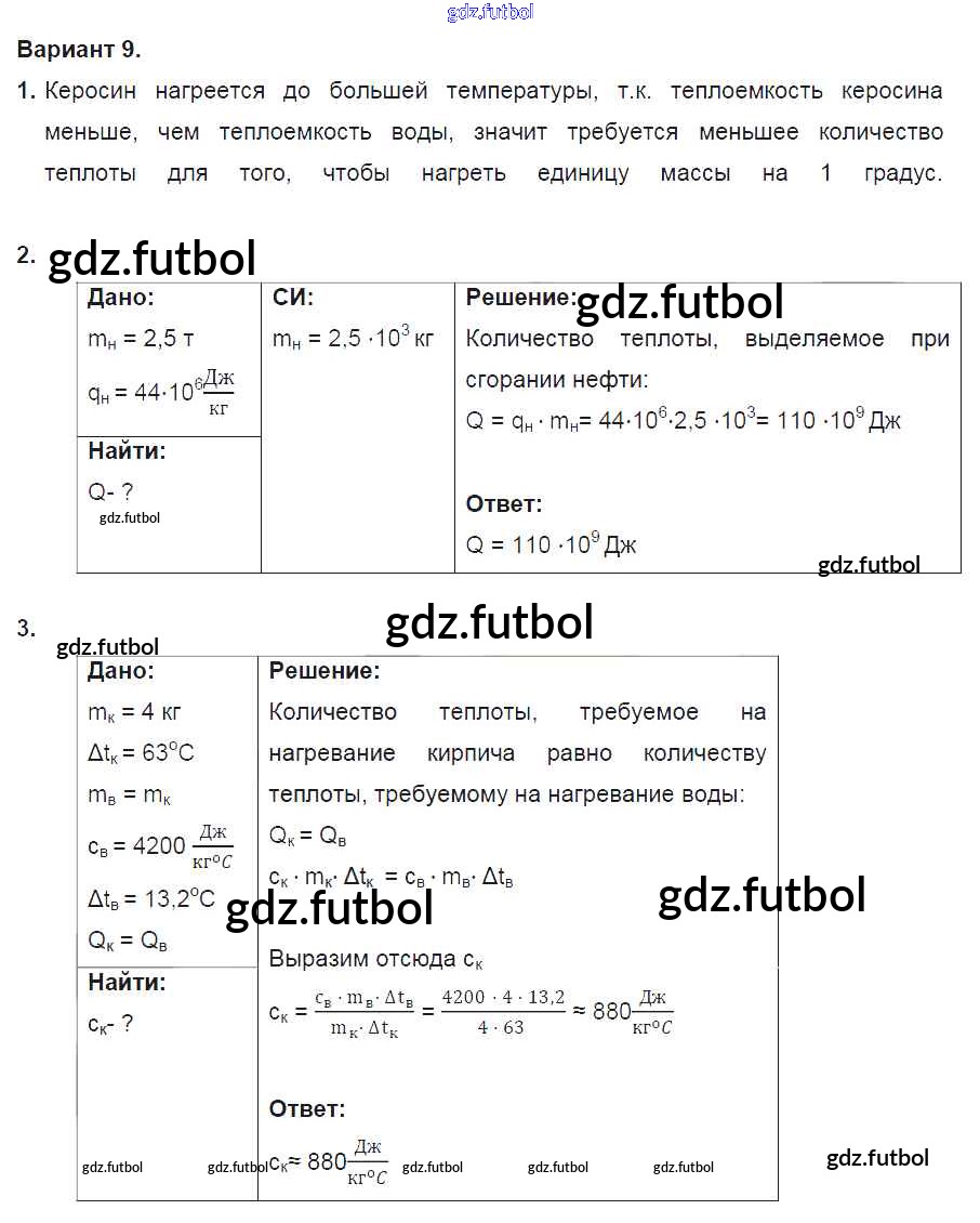 Готовые домашние задания по Физике за 8 класс Марон Дидактические материалы Вертикаль 2016 ФГОС - СР №3. Количество теплоты. Энергия топлива. Варианты 9