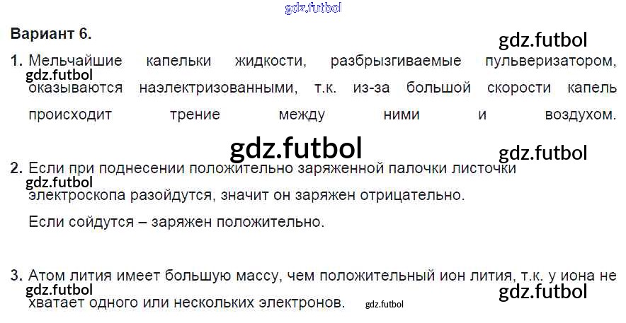 Готовые домашние задания по Физике за 8 класс Марон Дидактические материалы Вертикаль 2016 ФГОС - СР №6. Электризация тел. Электрическое поле. Строение атома. Варианты 6