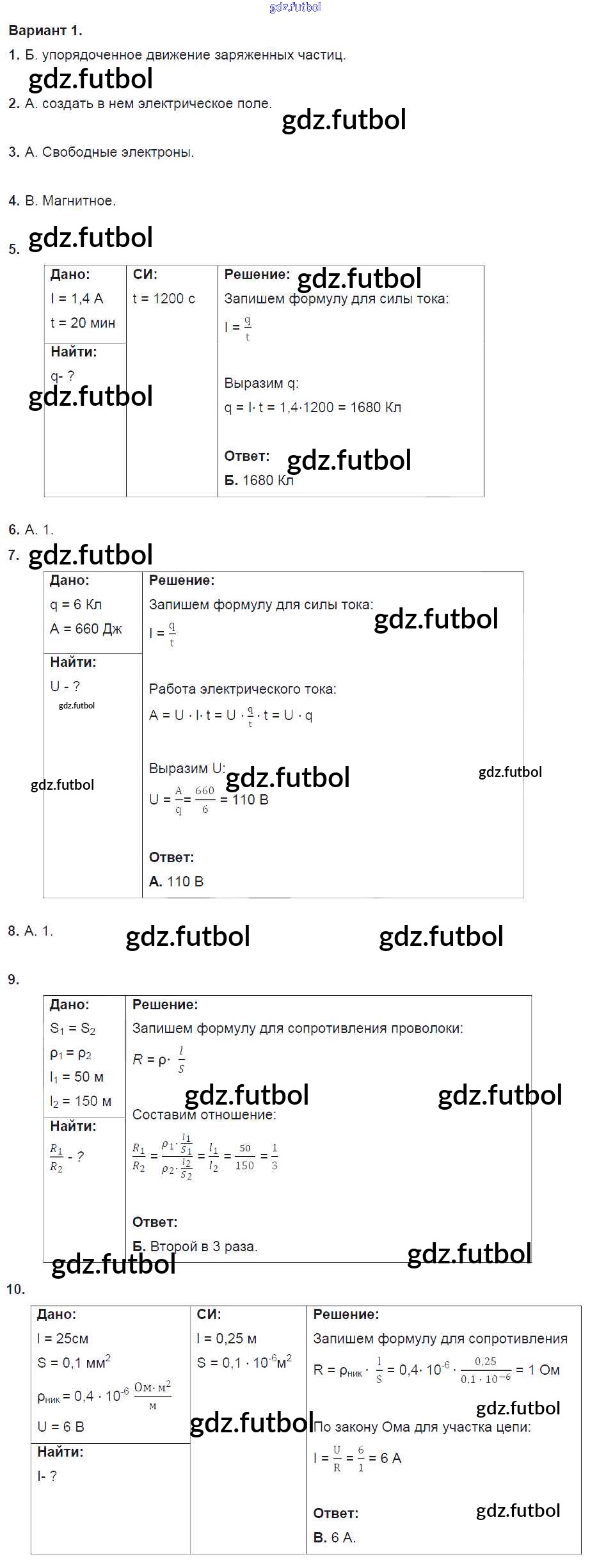 Готовые домашние задания по Физике за 8 класс Марон Дидактические материалы Вертикаль 2016 ФГОС - Тест №6.Сила тока. Напряжение. Сопротивление. Закон Ома для участка цепи. Варианты 1