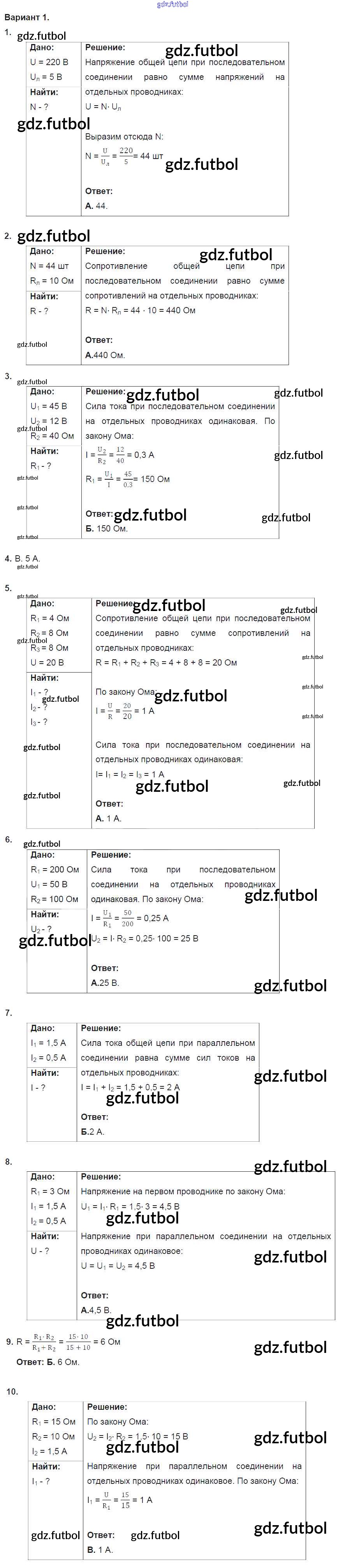Готовые домашние задания по Физике за 8 класс Марон Дидактические материалы Вертикаль 2016 ФГОС - Тест №7. Соединение проводников. Варианты 1