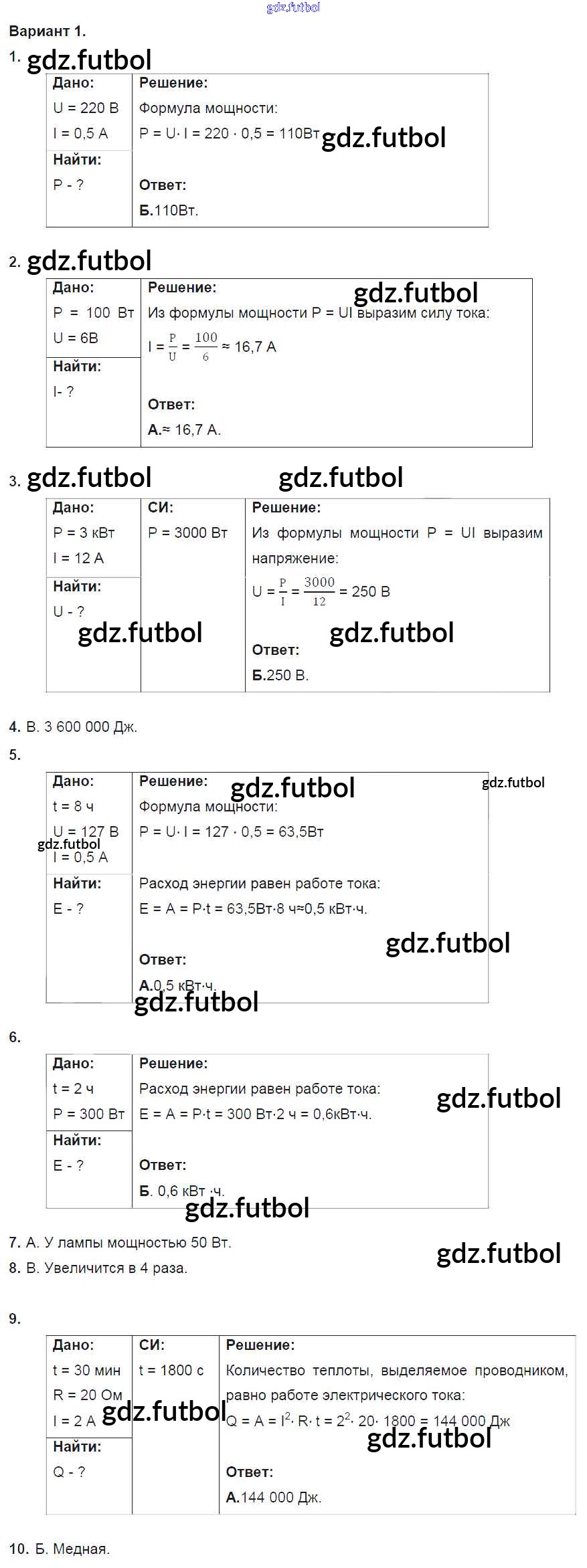 Готовые домашние задания по Физике за 8 класс Марон Дидактические материалы Вертикаль 2016 ФГОС - Тест №8. Работа и мощность тока. Варианты 1