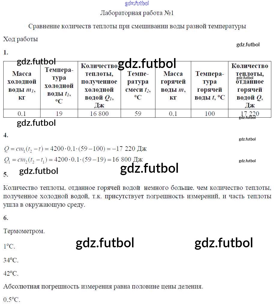 Готовые домашние задания по Физике за 8 класс Минькова Тетрадь для лабораторных работ УМК 2014 ФГОС - Лабораторные работы ЛР №1. Сравнение количеств теплоты при смешивании воды разной температуры
