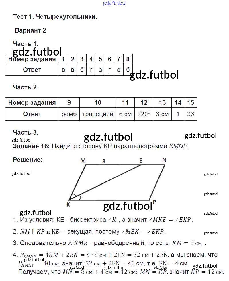 Готовые домашние задания по Геометрии за 8 класс Фарков Тесты УМК 2014 ФГОС - Глава 1. Четырехугольники вариант №2