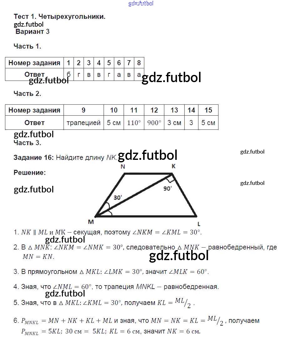 Готовые домашние задания по Геометрии за 8 класс Фарков Тесты УМК 2014 ФГОС - Глава 1. Четырехугольники вариант №3
