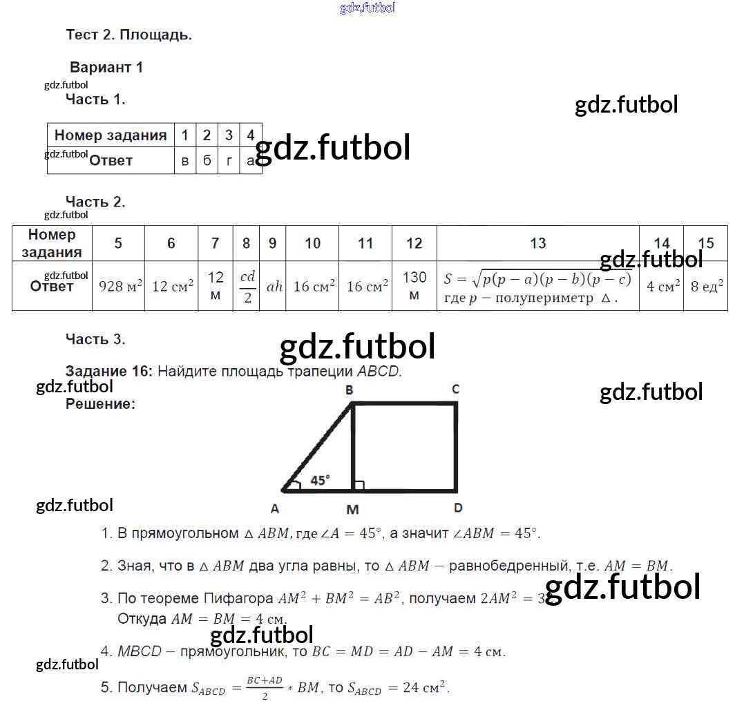 Готовые домашние задания по Геометрии за 8 класс Фарков Тесты УМК 2014 ФГОС - Глава 2. Площадь вариант №1