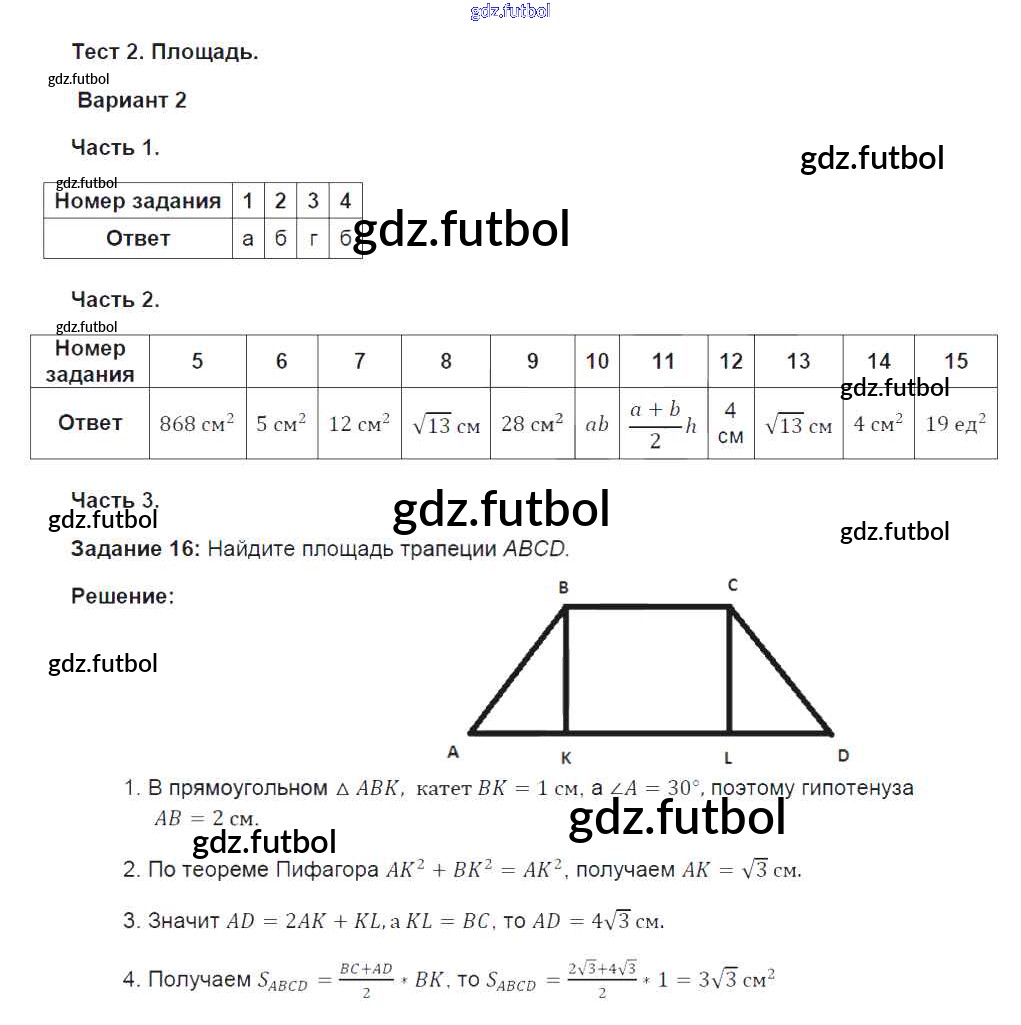 Готовые домашние задания по Геометрии за 8 класс Фарков Тесты УМК 2014 ФГОС - Глава 2. Площадь вариант №2