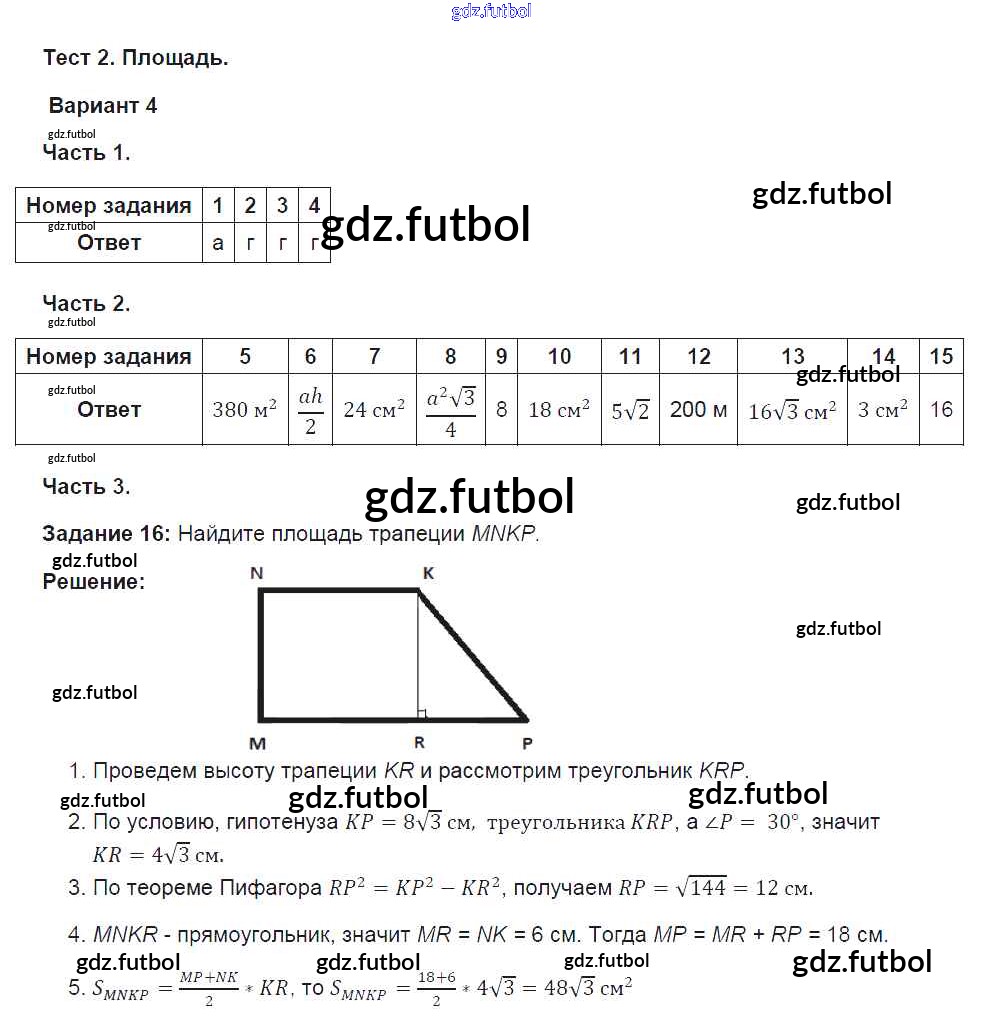Готовые домашние задания по Геометрии за 8 класс Фарков Тесты УМК 2014 ФГОС - Глава 2. Площадь вариант №4