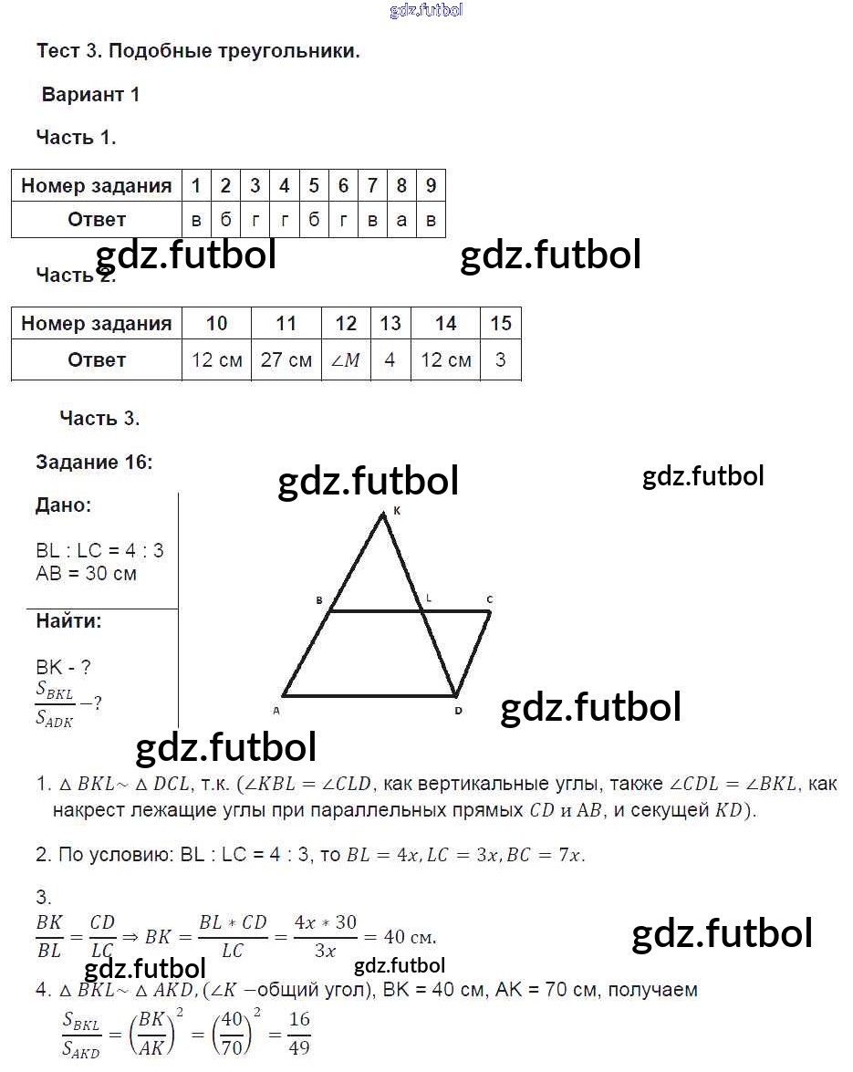 Готовые домашние задания по Геометрии за 8 класс Фарков Тесты УМК 2014 ФГОС - Глава 3. Подобные треугольники вариант №1