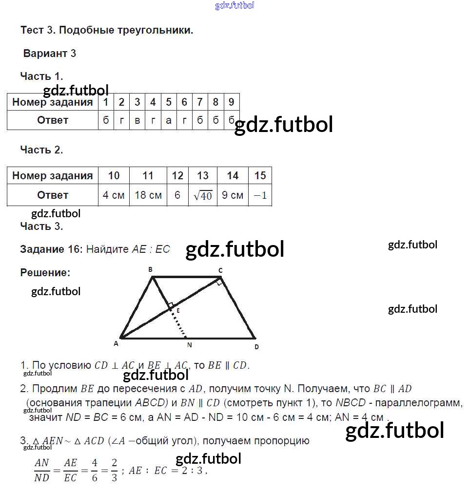 Готовые домашние задания по Геометрии за 8 класс Фарков Тесты УМК 2014 ФГОС - Глава 3. Подобные треугольники вариант №3