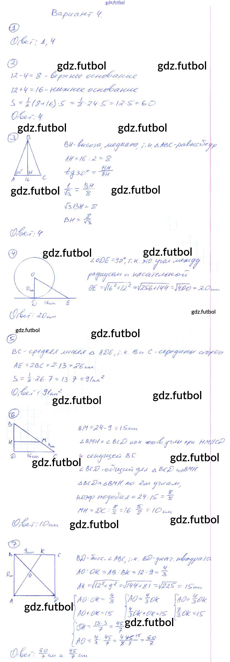 Готовые домашние задания по Геометрии за 8 класс Мельникова Контрольные работы УМК 2013 ФГОС - КР-5. Итоговая Вариант №4