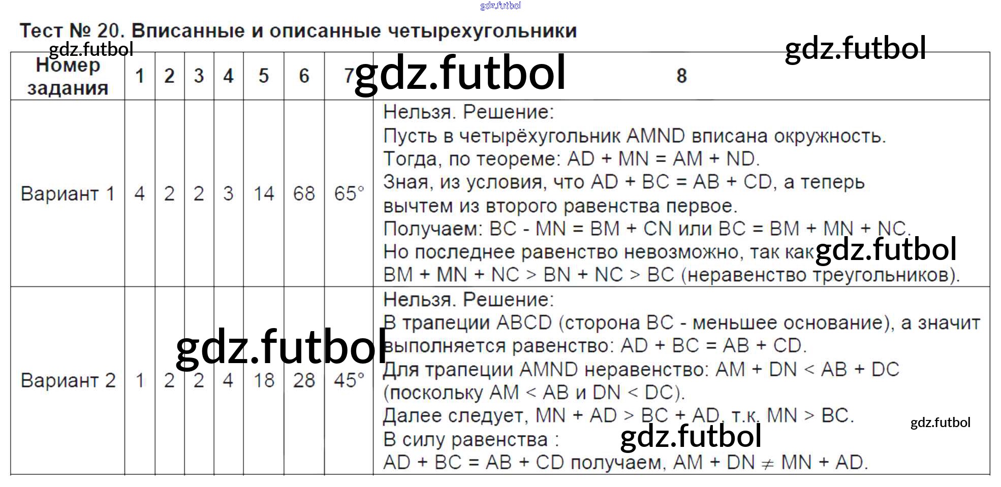 Готовые домашние задания по Геометрии за 8 класс Рязановский Контрольно-измерительные материалы (КИМ) 2014 ФГОС - Тесты Тест №20. Вписанные и описанные четырехугольники