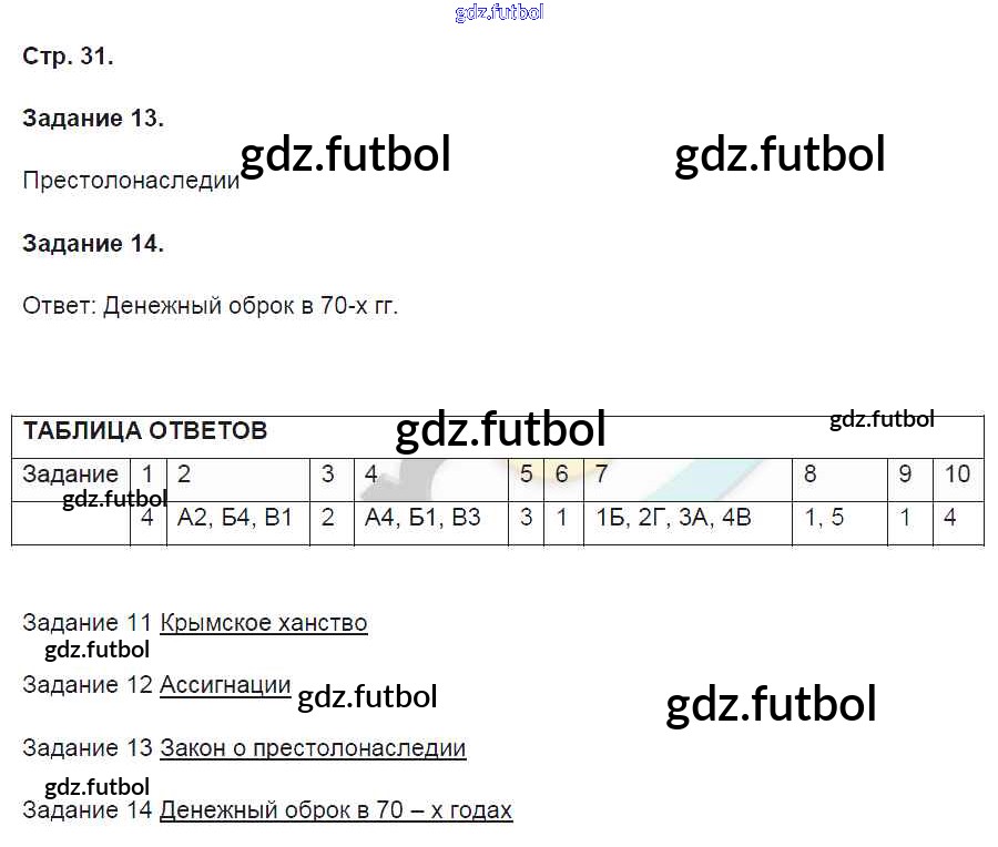 Готовые решения задач (ГДЗ) по Истории восьмой класс Артасов Контрольные работы УМК 2016 ФГОС - Страницы 31 доступны для различных учебных материалов. У нас вы сможете найти авторские решения для всех пособий, предназначенных для школьников. Не секрет, что в настоящее время многие школьники прибегают к использованию готовых решебников, ведь они содержат подробные ответы для каждого упражнения, представленного в учебнике.