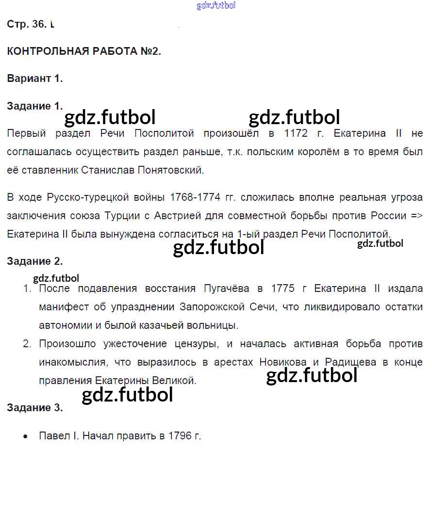 Готовые решения задач (ГДЗ) по Истории восьмой класс Артасов Контрольные работы УМК 2016 ФГОС - Страницы 36 доступны для различных учебных материалов. У нас вы сможете найти авторские решения для всех пособий, предназначенных для школьников. Не секрет, что в настоящее время многие школьники прибегают к использованию готовых решебников, ведь они содержат подробные ответы для каждого упражнения, представленного в учебнике.