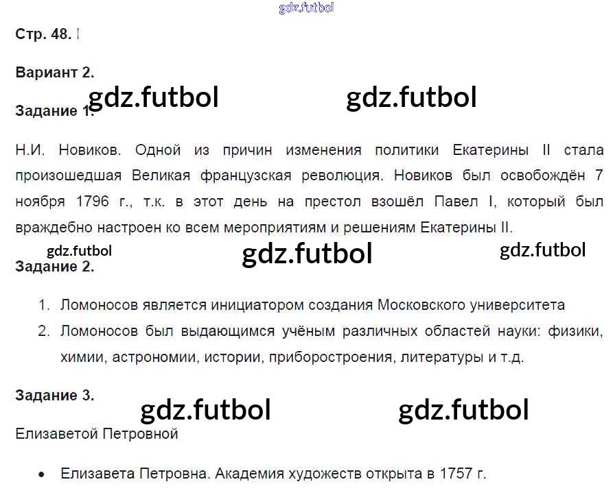 Готовые решения задач (ГДЗ) по Истории восьмой класс Артасов Контрольные работы УМК 2016 ФГОС - Страницы 48 доступны для различных учебных материалов. У нас вы сможете найти авторские решения для всех пособий, предназначенных для школьников. Не секрет, что в настоящее время многие школьники прибегают к использованию готовых решебников, ведь они содержат подробные ответы для каждого упражнения, представленного в учебнике.