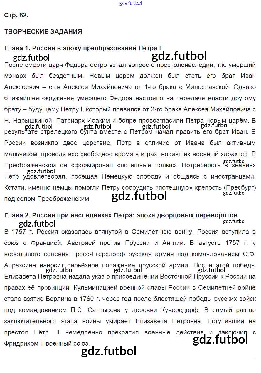Готовые решения задач (ГДЗ) по Истории восьмой класс Артасов Контрольные работы УМК 2016 ФГОС - Страницы 62 доступны для различных учебных материалов. У нас вы сможете найти авторские решения для всех пособий, предназначенных для школьников. Не секрет, что в настоящее время многие школьники прибегают к использованию готовых решебников, ведь они содержат подробные ответы для каждого упражнения, представленного в учебнике.
