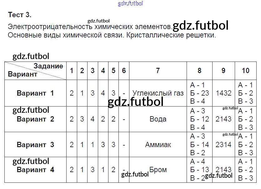 Готовые решения задач (ГДЗ) по Химии восьмой класс Боровских Тесты УМК 2013 ФГОС - Тесты 3 доступны для различных учебных материалов. У нас вы сможете найти авторские решения для всех пособий, предназначенных для школьников. Не секрет, что в настоящее время многие школьники прибегают к использованию готовых решебников, ведь они содержат подробные ответы для каждого упражнения, представленного в учебнике.