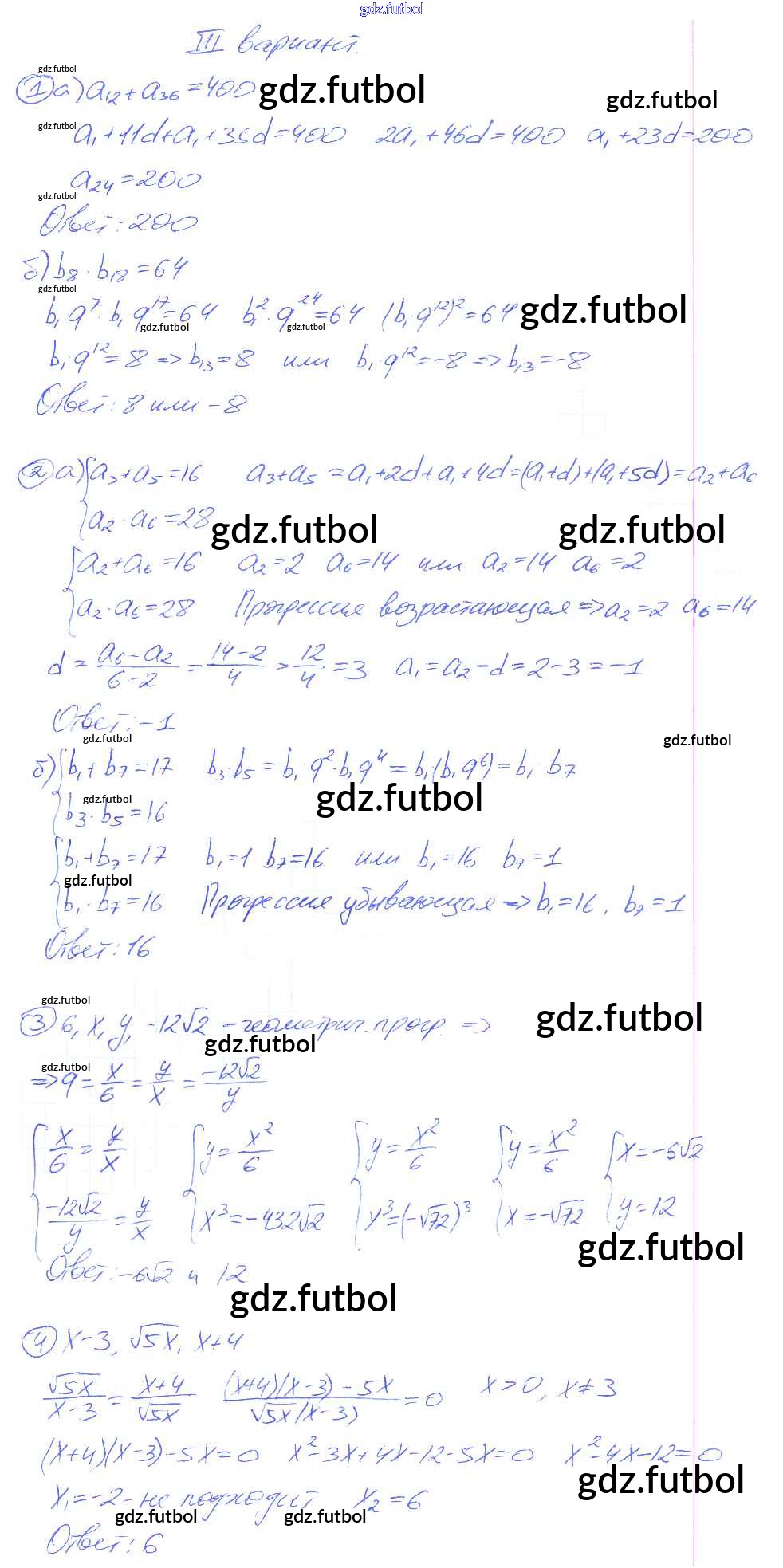 Готовые домашние задания по Алгебре за 9 класс Потапов Дидактические материалы МГУ - школе 2010 ФГОС - СР №20. Задачи на прогрессии вариант 3
