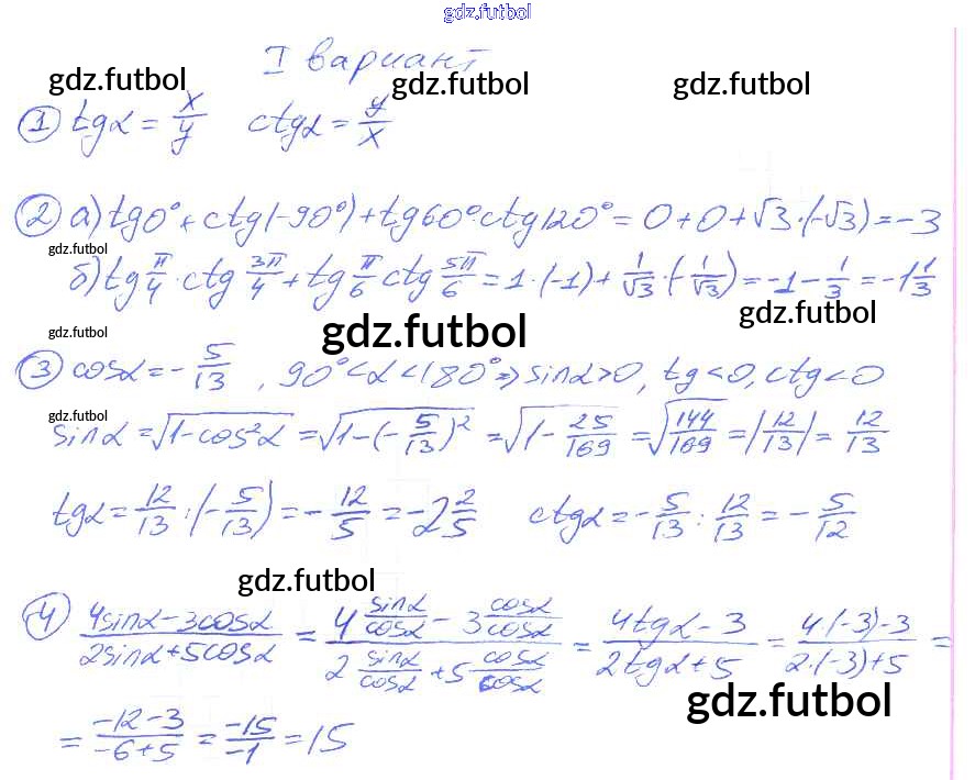 Готовые домашние задания по Алгебре за 9 класс Потапов Дидактические материалы МГУ - школе 2010 ФГОС - СР №25. Тангенс и котангенс угла вариант 1