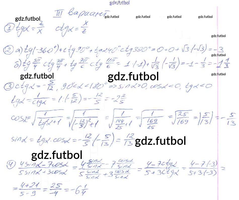 Готовые домашние задания по Алгебре за 9 класс Потапов Дидактические материалы МГУ - школе 2010 ФГОС - СР №25. Тангенс и котангенс угла вариант 3