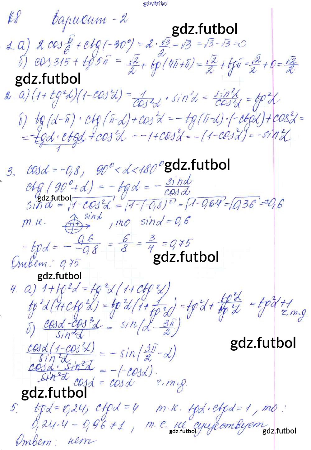 Готовые домашние задания по Алгебре за 9 класс Журавлев Контрольные и самостоятельные работы УМК 2016 ФГОС - К-8. Свойства тригонометрических функций. Тригонометрические тождества. Формулы приведения Вариант №2