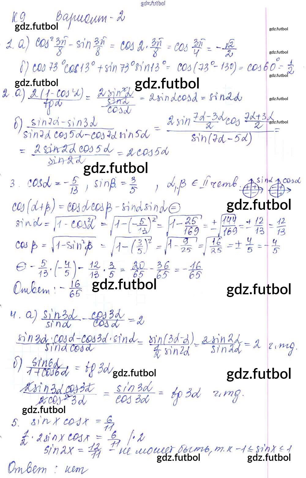Готовые домашние задания по Алгебре за 9 класс Журавлев Контрольные и самостоятельные работы УМК 2016 ФГОС - К-9. Формулы сложения и их следствия Вариант №2