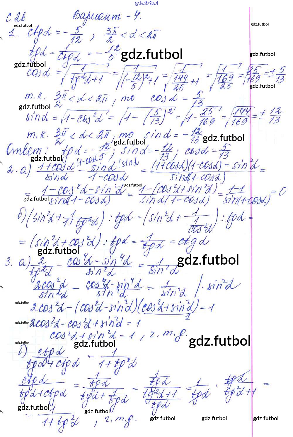 Готовые домашние задания по Алгебре за 9 класс Журавлев Контрольные и самостоятельные работы УМК 2016 ФГОС - С-26. Тригонометрические тождества и их применение Вариант №4