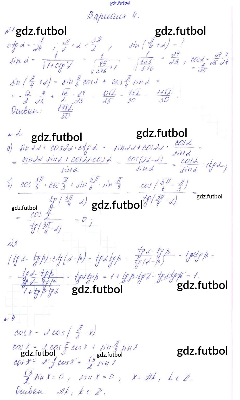 Готовые домашние задания по Алгебре за 9 класс Зив Дидактические материалы 2013 ФГОС - СР-14. Формулы сложения вариант 4