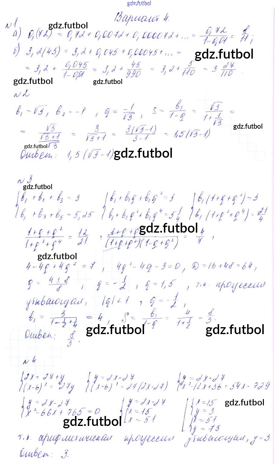 Готовые домашние задания по Алгебре за 9 класс Зив Дидактические материалы 2013 ФГОС - СР-19. Бесконечно убывающая геометрическая прогрессия. Смешанные задачи на прогрессии вариант 4
