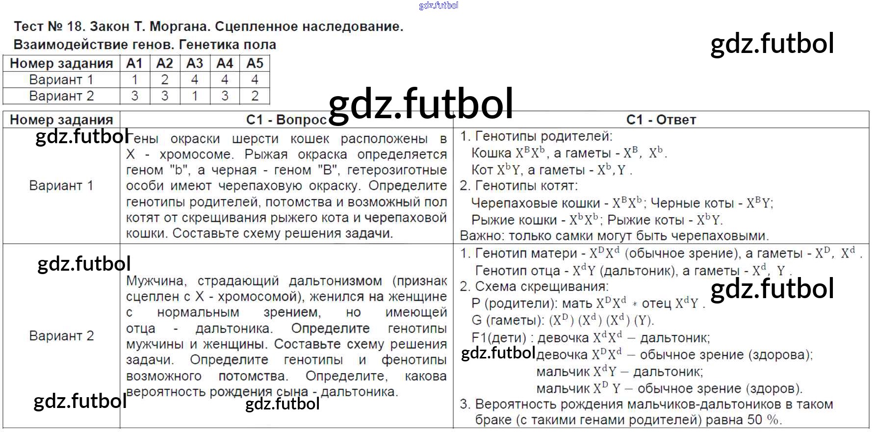 Готовые домашние задания по Биологии за 9 класс Богданов Контрольно-измерительные материалы (КИМ) 2017 ФГОС - Тесты Тест №18. Закон Т. Моргана. Сцепленное наследование. Взаимодействие генов. Генетика пола