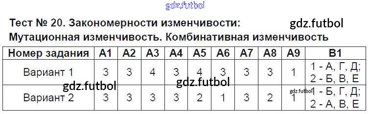 Готовые домашние задания по Биологии за 9 класс Богданов Контрольно-измерительные материалы (КИМ) 2017 ФГОС - Тесты Тест №20. Закономерности изменчивости - Мутационная изменчивость. Комбинативная изменчивость