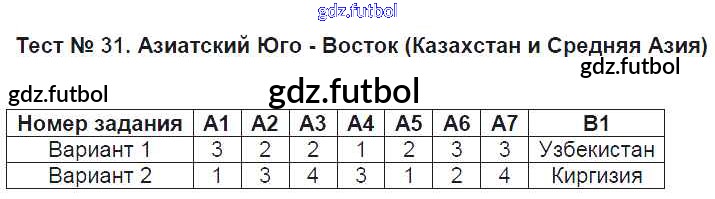 Готовые домашние задания по Географии за 9 класс Жижина Контрольно-измерительные материалы (КИМ) 2017 ФГОС - Тесты Тест №31. Азиатский Юго - Восток (Казахстан и Средняя Азия)