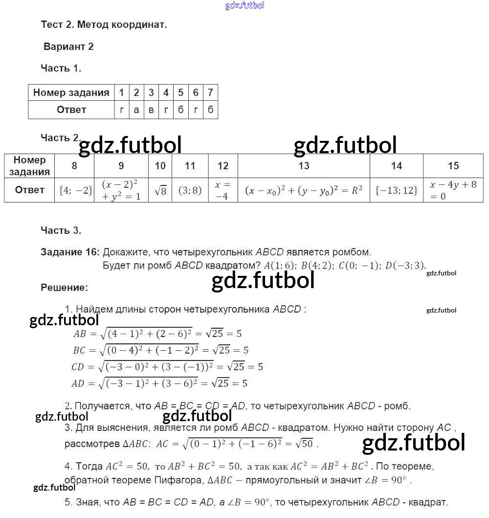 Готовые решения задач (ГДЗ) по Геометрии девятый класс Фарков Тесты УМК 2016 ФГОС - Тема 2. Варианты 2 доступны для различных учебных материалов. У нас вы сможете найти авторские решения для всех пособий, предназначенных для школьников. Не секрет, что в настоящее время многие школьники прибегают к использованию готовых решебников, ведь они содержат подробные ответы для каждого упражнения, представленного в учебнике.
