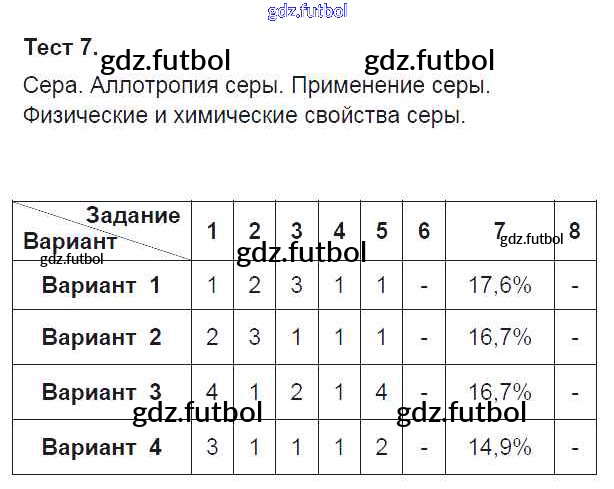 Готовые домашние задания по Химии за 9 класс Боровских Тесты УМК 2013 ФГОС - Тесты Тест-7. Сера. Аллотропия серы. Применение серы
