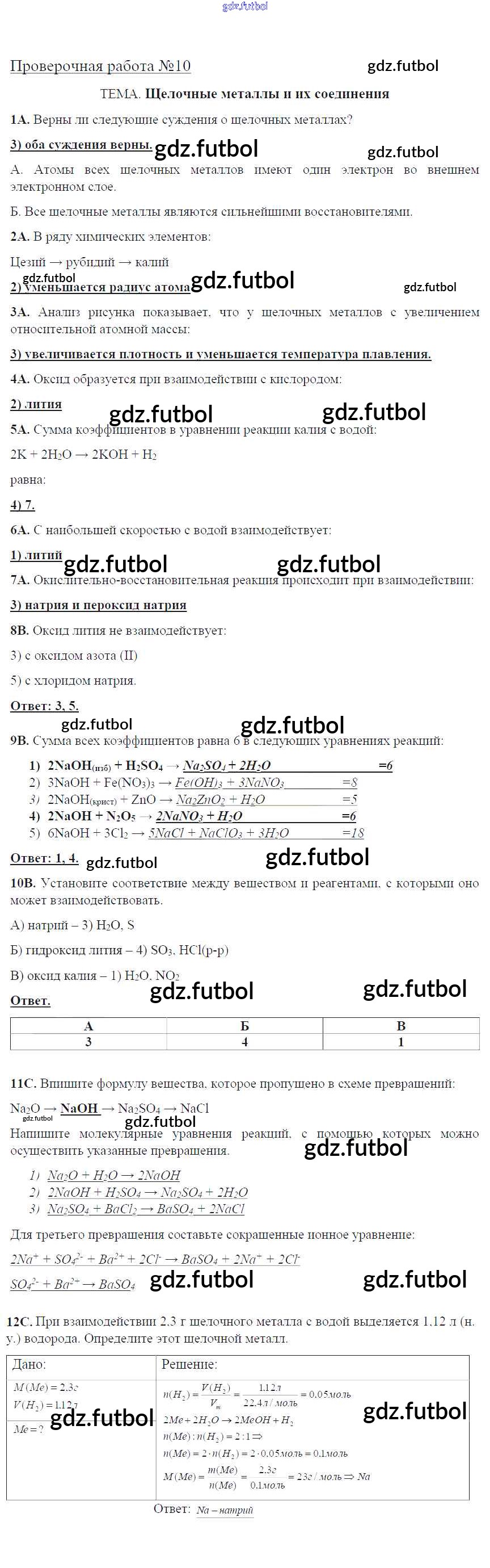 Готовые домашние задания по Химии за 9 класс Габриелян Тетрадь для оценки качества знаний Вертикаль 2017 ФГОС - Проверочные работы ПР-10. Щелочные металлы и их соединения
