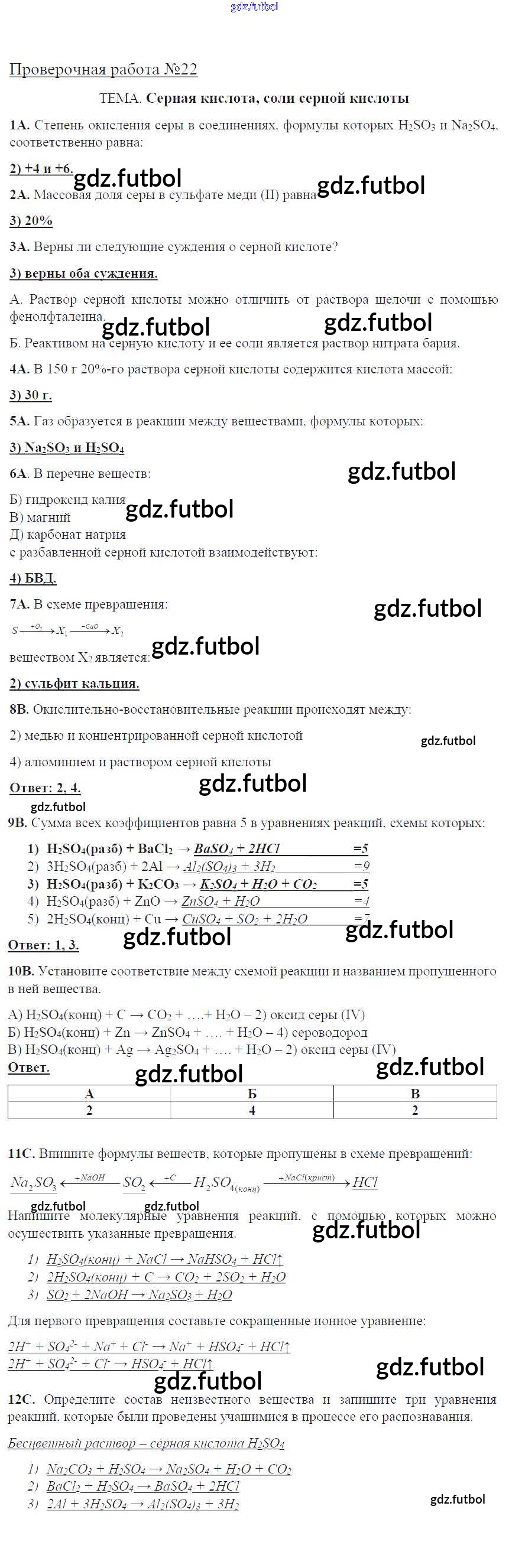 Готовые домашние задания по Химии за 9 класс Габриелян Тетрадь для оценки качества знаний Вертикаль 2017 ФГОС - Проверочные работы ПР-22. Серная кислота, соли серной кислоты