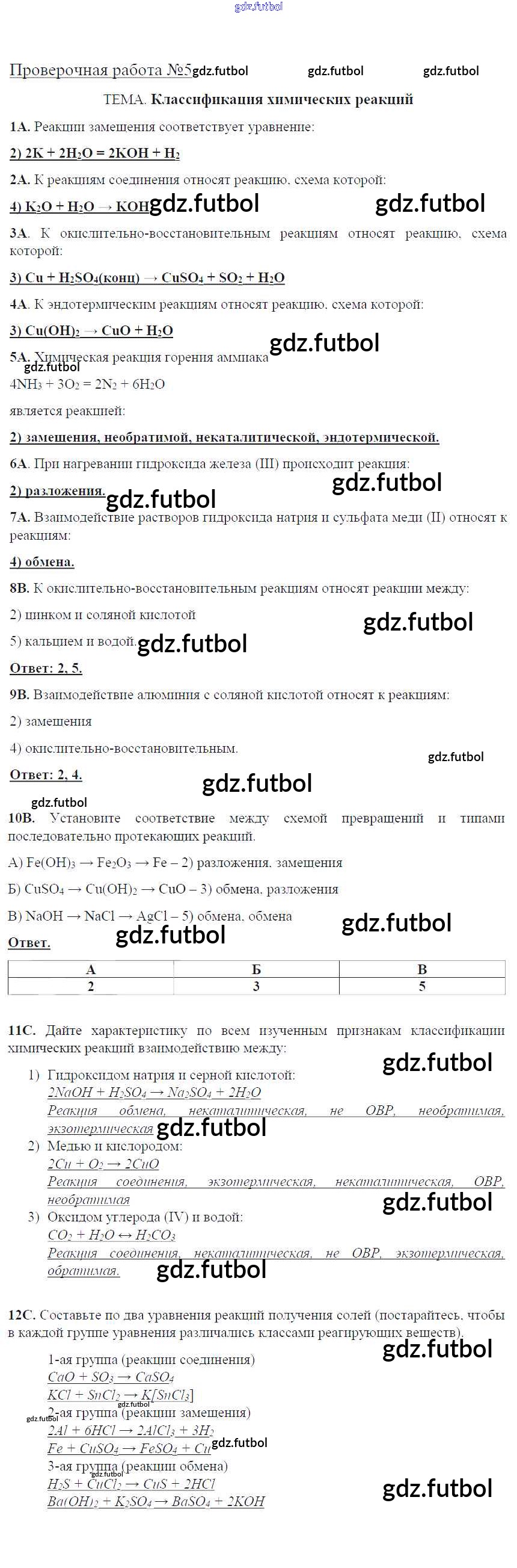 Готовые домашние задания по Химии за 9 класс Габриелян Тетрадь для оценки качества знаний Вертикаль 2017 ФГОС - Проверочные работы ПР-5. Классификация химических реакций