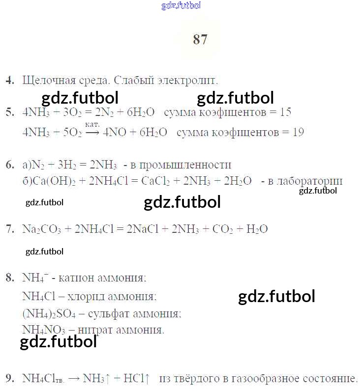 Готовые домашние задания по Химии за 9 класс Микитюк Рабочая тетрадь УМК 2014 ФГОС - Урок 34. Аммиак. Соли аммония стр.87