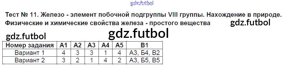 Готовые домашние задания по Химии за 9 класс Стрельникова Контрольно-измерительные материалы (КИМ) 2017 ФГОС - Тесты Тест №11. Железо - элемент побочной подгруппы viii группы. Нахождение в природе